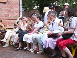 08.07. Mit einem Familiengottesdienst begann das Gemeindefest. Thema des Predigtgesprächs und der Ansprache waren die Verse 4+5+9 im 2. Kapitel des 1. Petrusbriefes - vor allem die Rede von Christus als dem „lebendigen Stein“, in der begründet ist, dass dann auch von uns Christinnen und Christen als „lebendigen Steinen“ gesprochen wird. „le petit chœur“ (Leitung: Olaf Joksch) trug zur musikalischen Ausgestaltung des Gottesdienstes bei. – Nach dem Gottesdienstes, während des Kirchkaffees bzw. des Begrüßungstrunks im Gemeindehof und -garten sorgte dann zunächst der Orff-Kreis der Geistig-Behinderten-Seelsorge (Leitung: Heike Briceno Velasquez) für die Unterhaltung. Das Wetter meinte es sehr gut mit uns, so dass alle im Schatten der Pavillons die vielfältigen delikaten Speisen des mittäglichen Büffets genossen. Zur nötigen Bewegung leitete danach Rosemarie Schröder mit Sitztänzen und Darbietungen des Volkstanzkreises an, an denen bald auch weitere Tanzwillige teilnahmen. Die Kleinen amüsierten sich mit ihren Eltern bei Spielen mit dem bunten Seidenfaltschirm. Währenddessen hatte das Philharmonische Orchester Frankfurt mit unserem Organisten und Kirchenrechner Herbert Pipper am Klavier unter einem der Pavillons Platz genommen. Mit einem bunten Reigen schöner Melodien schufen sie eine schöne Atmosphäre für die Nachmittagsstunden – in denen dann wieder ein reich gedecktes Kuchenbüffet für das leibliche Wohlbefinden sorgte. Mit dem Kaffee klang der zweite Teil des Gemeindefestes aus. Durch fleißige HelferInnen war alles schnell wieder abgebaut, das Geschirr gespült – so dass noch eine kurze Ruhepause möglich war, bevor um 19 Uhr der Sonntag ausklang mit