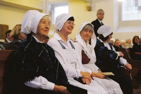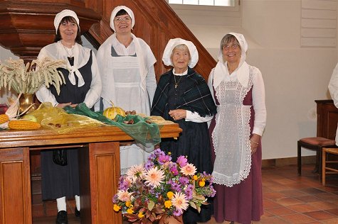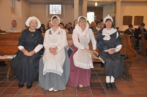 | Photo © Georg : Stilecht: Zur Eröffnung des Hugenotten-und Waldenserpfades sind unter den Gästen in der Französisch-reformierten Kirche auch diese vier Damen in der damaligen Tracht. | v.l.n.r : Frau Schneider, Frau Rudolf, Frau Desor, Frau Zeller, die Kostüme wurden nach historischen Vorlagen selbst geschneidert. |