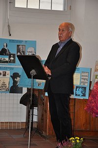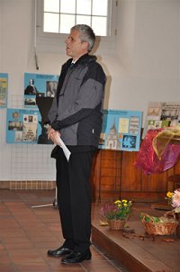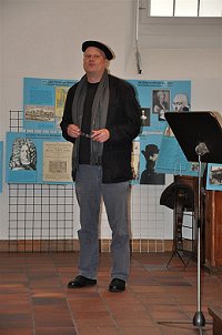 | Wolfgang Löll, Musiklehrer und Komponist, begleitete die Veranstaltung musikalisch und führt auch in die eigene Komposition zur "Ehrung der Hugenotten" ein. | Hans-Georg Ruppel, ehemals Stadtarchivar Offenbachs, berichtet über die Geschichte der Waldenser, Hugenotten und der Französisch-Reformierten Gemeinde in Offenbach am Main. | Rainer Maus, Präses der Französisch-Reformierten Gemeinde Offenbach am Main 1699, moderierte die Veranstaltung. | Wolfgang Löll am Flügel. |
